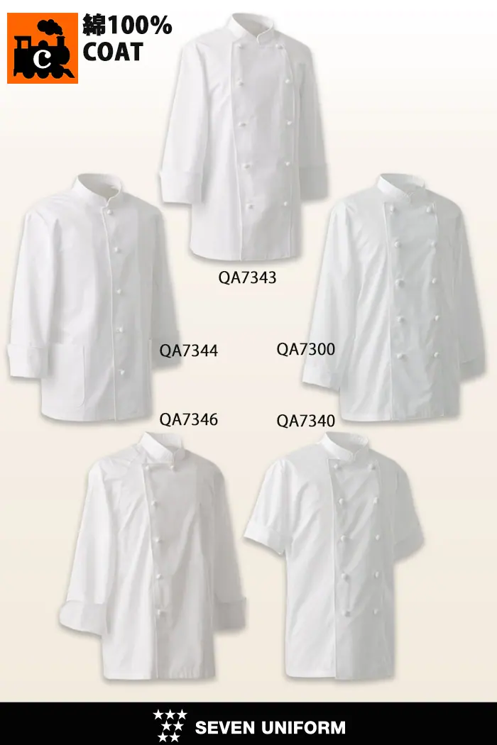 コックコートは清潔感ある白をベースに、さりげないデザインアクセントや、アシンメトリーな襟もとのラインがおしゃれ。