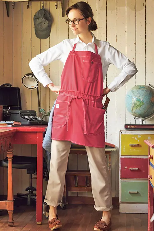 ひらひらゆれる裾がかわいいエプロンはデザインが2パターン楽しめ、後ろのボタンを留めればスマートに。外すと裾がひらひら揺れて可愛らしい印象に着こなせます。