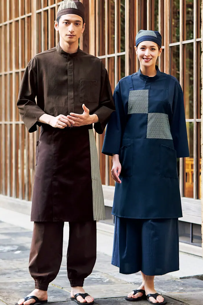 飲食店・サービス制服ユニフォームはコーディネートから選ぶ – 和風店舗にオススメ ノーカラーの和風シャツがスタイリッシュな雰囲気を醸し出す和風男女コーディネート