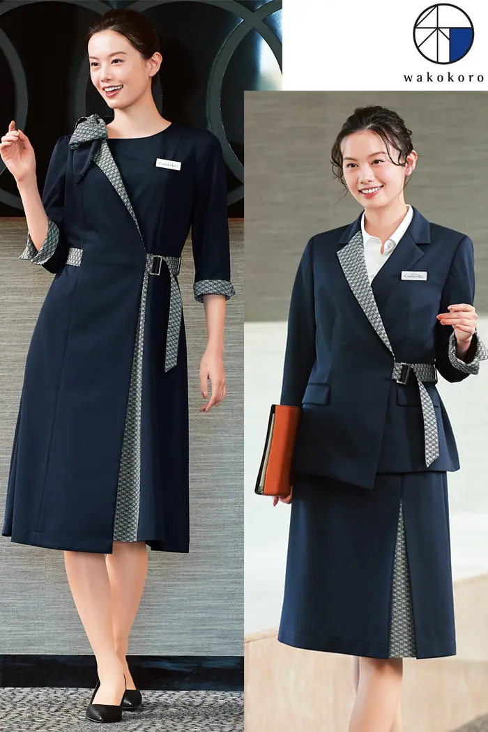 左モデルはテーラードジャケットの下にブラックのカットソーとAラインスカートを合わせて定番接客スタイルに、スカーフで華やかさをプラス。 右モデルは丸みのあるエリがかわいいジャケットに、プリーツスカートで甘めスタイルに仕上げました。