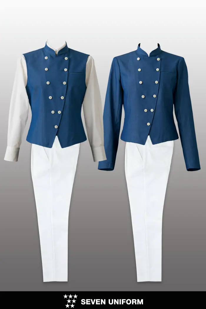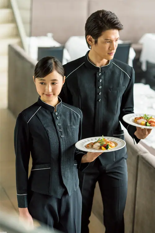 飲食店・サービス制服ユニフォームはコーディネートから選ぶ – 高級飲食店・ホテル 上質なオリエンタルなおもてなしを演出するノーカラージャケットスタイル