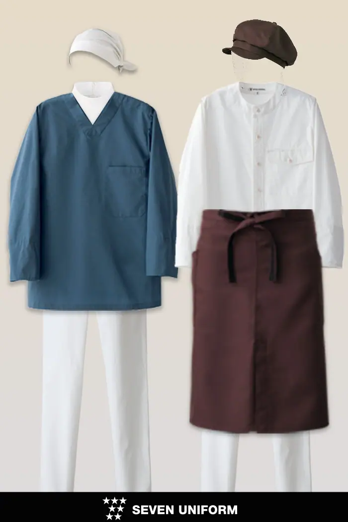 ブラウンベースの厨房、カフェ制服コーデ。コックコートは純色ブラウン(茶)にグレーをまぜた落ち着いたトーンのアイテムを。