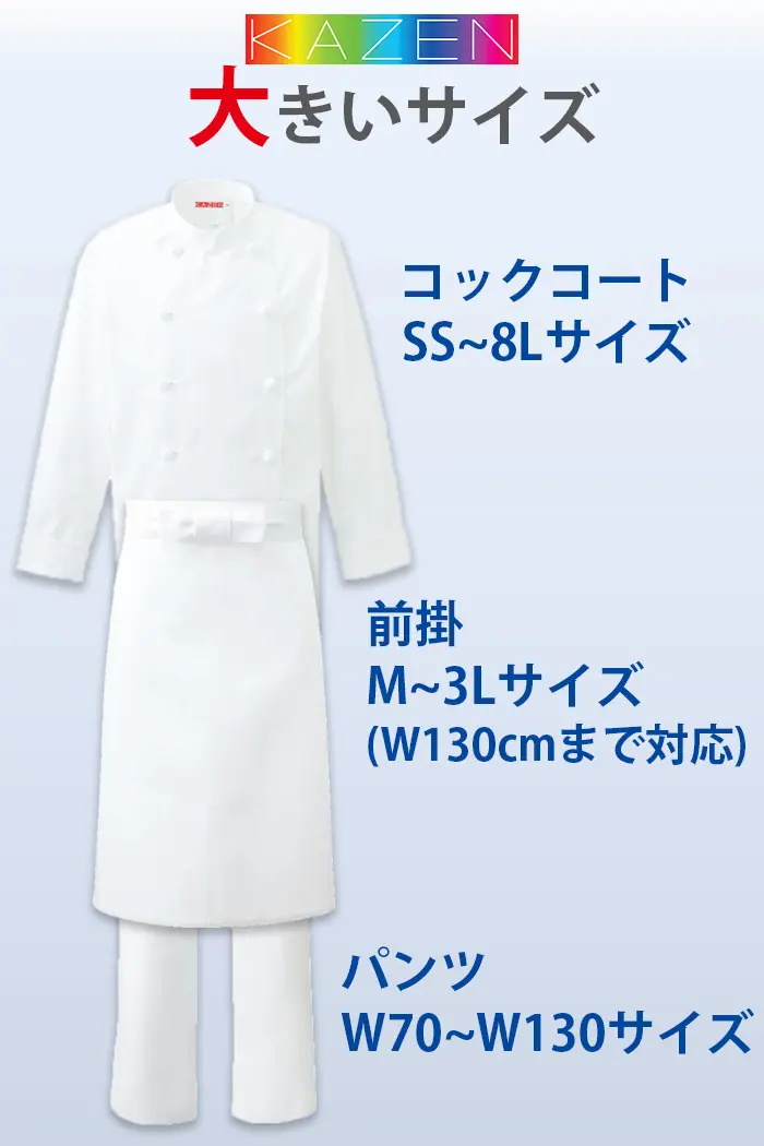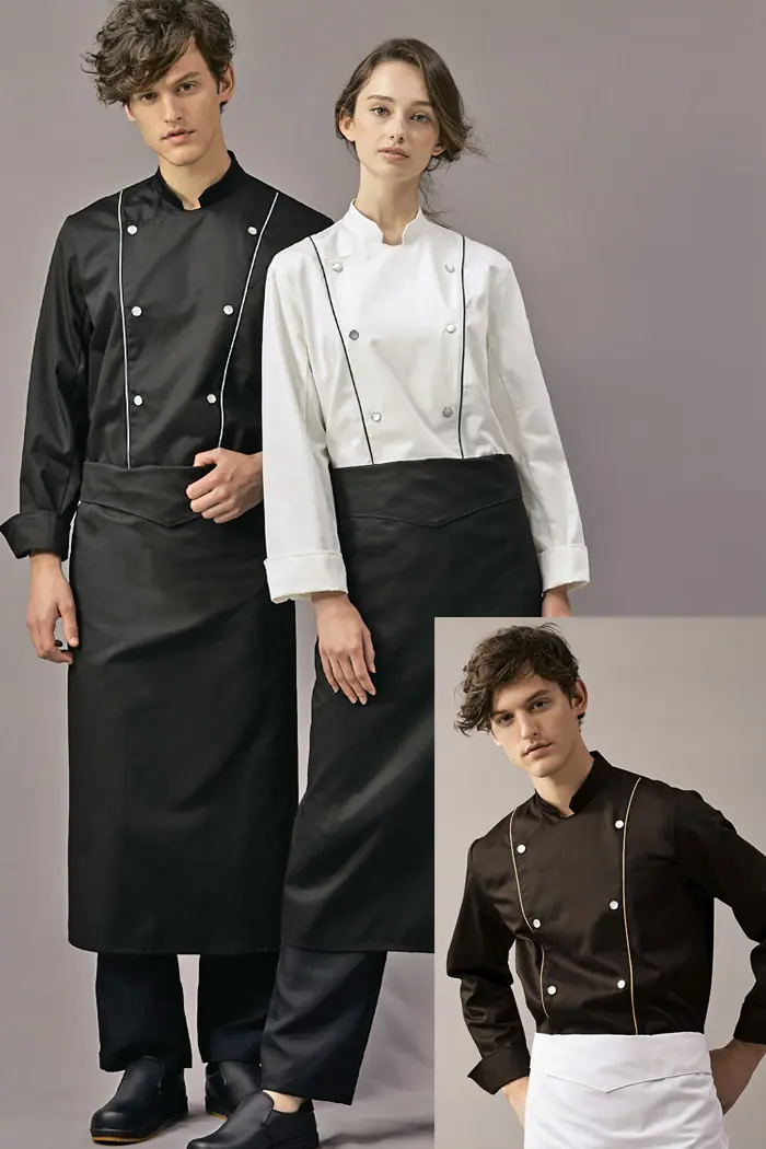 コックコートはパール調のボタンがアクセント。2本ラインが目を引き、印象もすっきり。スタイリッシュな1着です。(男性:黒、女性:白着用)