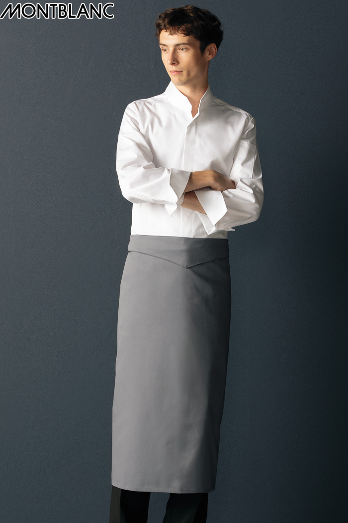ロングエプロンは結び目が隠れてすっきりした印象のもの。サロンエプロンはパイピングがアクセントのものをチョイスしています。