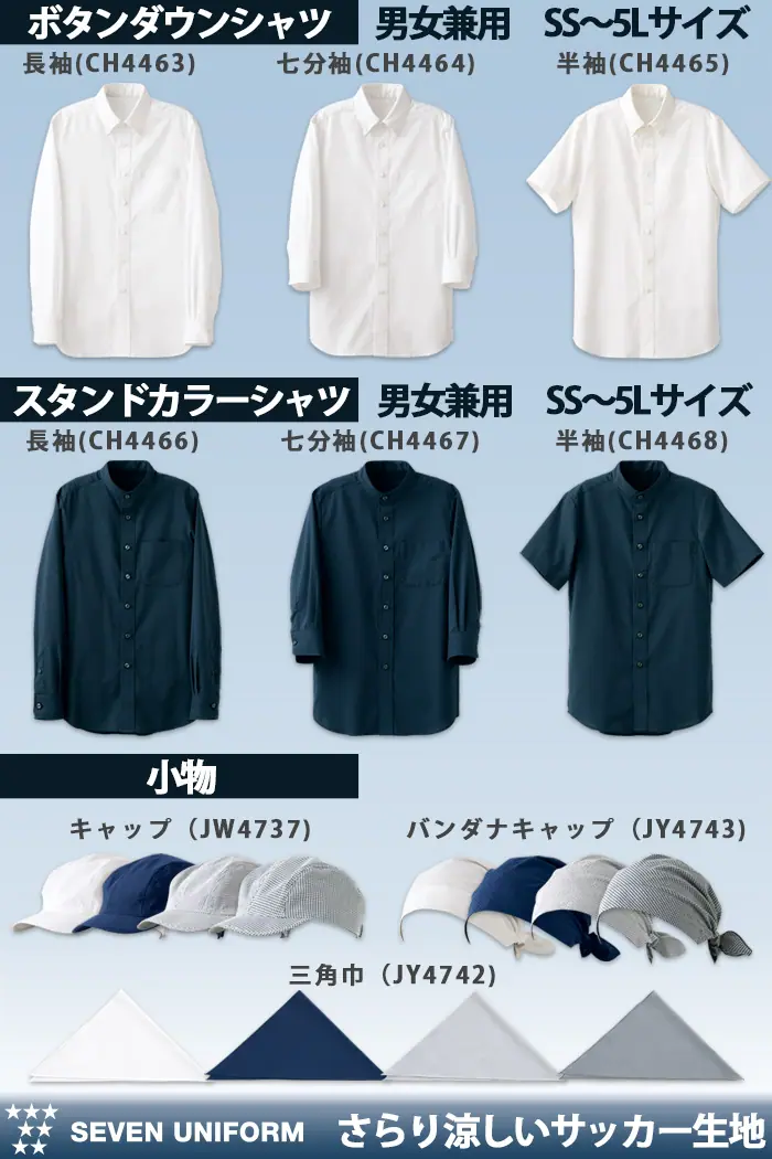 飲食店・サービス制服ユニフォームはコーディネートから選ぶ – さらり爽やか夏も快適なサッカー生地シリーズ シャツ・帽子
