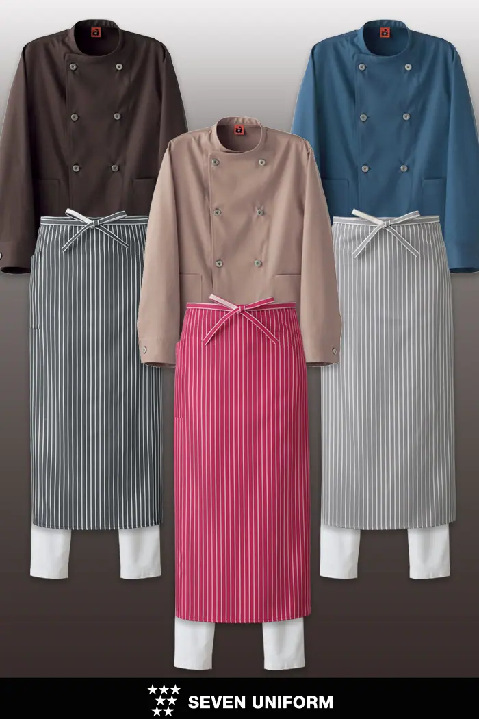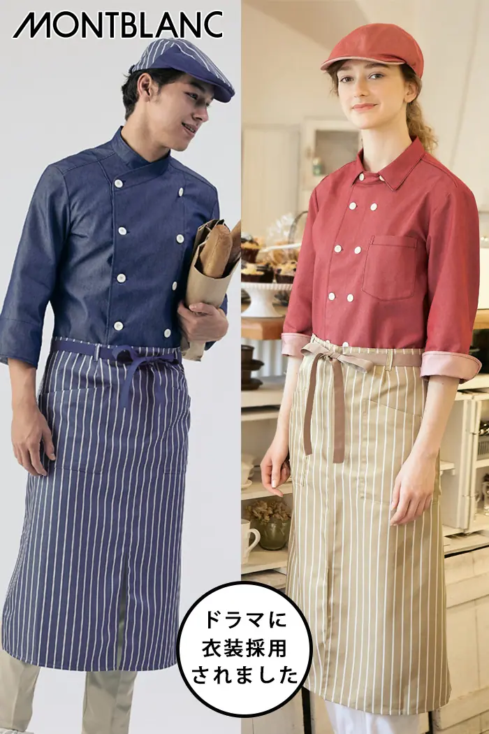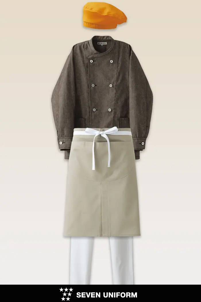 コックコートは経年劣化しない麻調デニム生地。綿デニムのような色落ちがほぼ無いのでいつまでもきれいな色のままを保ちます。麻は入っていませんが麻のようなドライタッチ感、適度なハリコシが着用時に高級感を醸し出します。デニムのトップスが印象的なので、カウンター越しの接客がメインとなるデパ地下系の食品販売等にお勧めです。ブラウンやオレンジのような暖色のコーディネートは、食品を美味しそうに見せる効果も。ナチュラルでもあり、程よいカジュアル感のあるコーディネートです。