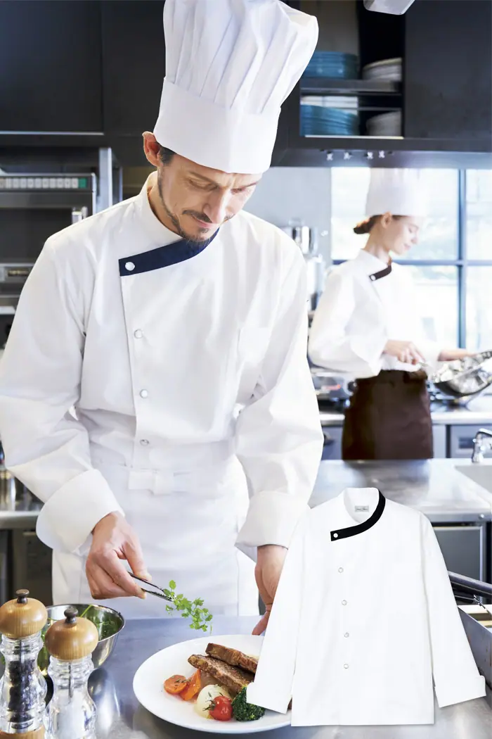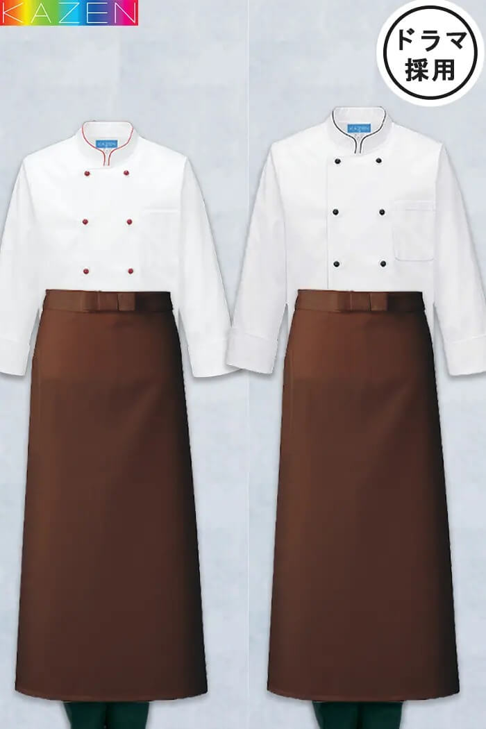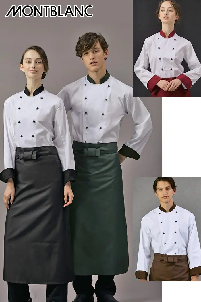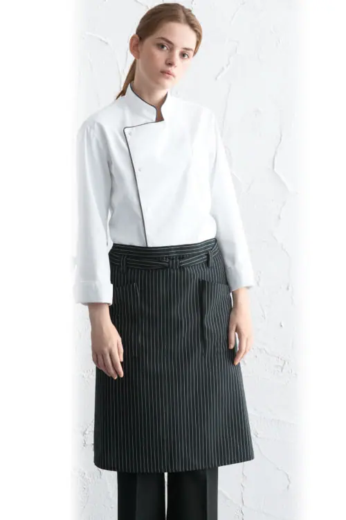 飲食店・サービス制服ユニフォームはコーディネートから選ぶ – スタイリッシュなコックコートにストライプ柄エプロンでモダンクラシカルコーディネート
