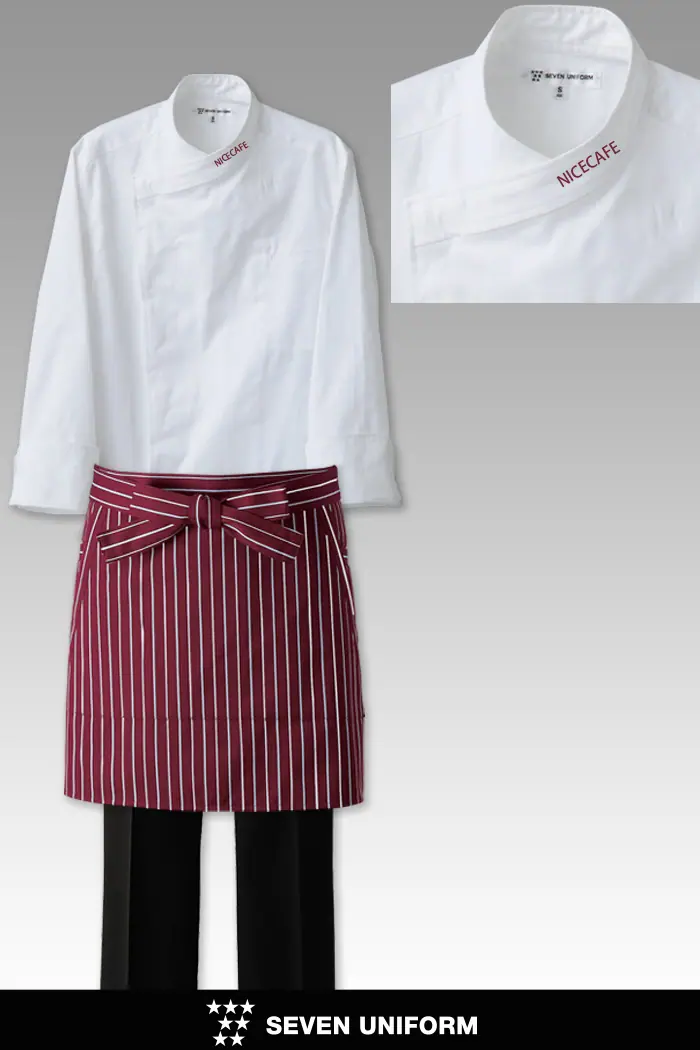 ボタンが見えない仕様のすっきりとしたスタイリッシュなコックコートに、ワイン色のストライプ柄エプロンをコーディネートしました。