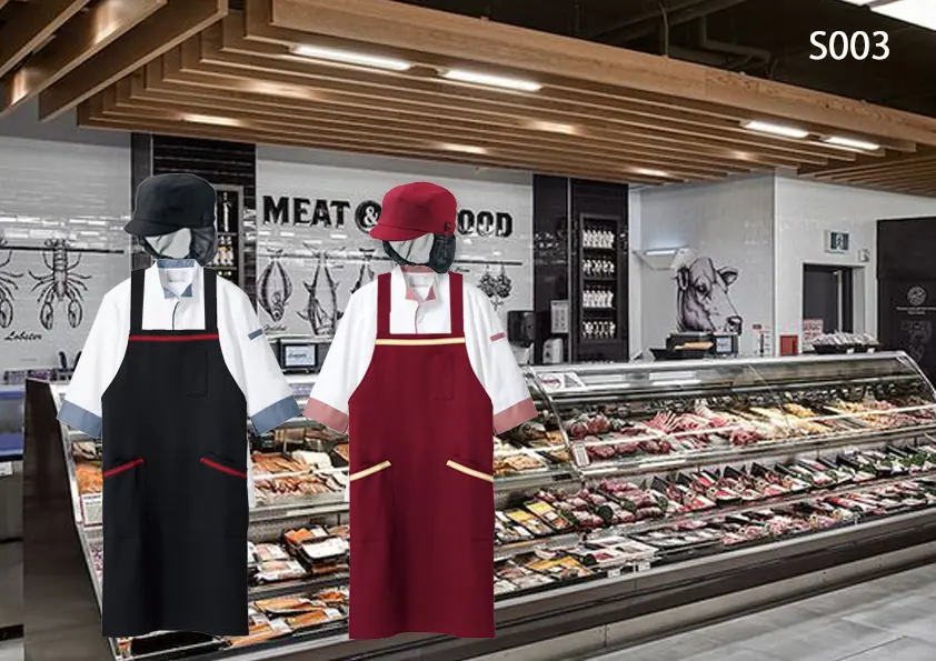 codeF25-S001 飲食店販売店店舗制服コーデ 食品スーパー・販売店向け|清潔感と親しみやすさを両立する胸付きエプロン&シャツのユニフォームコーデ