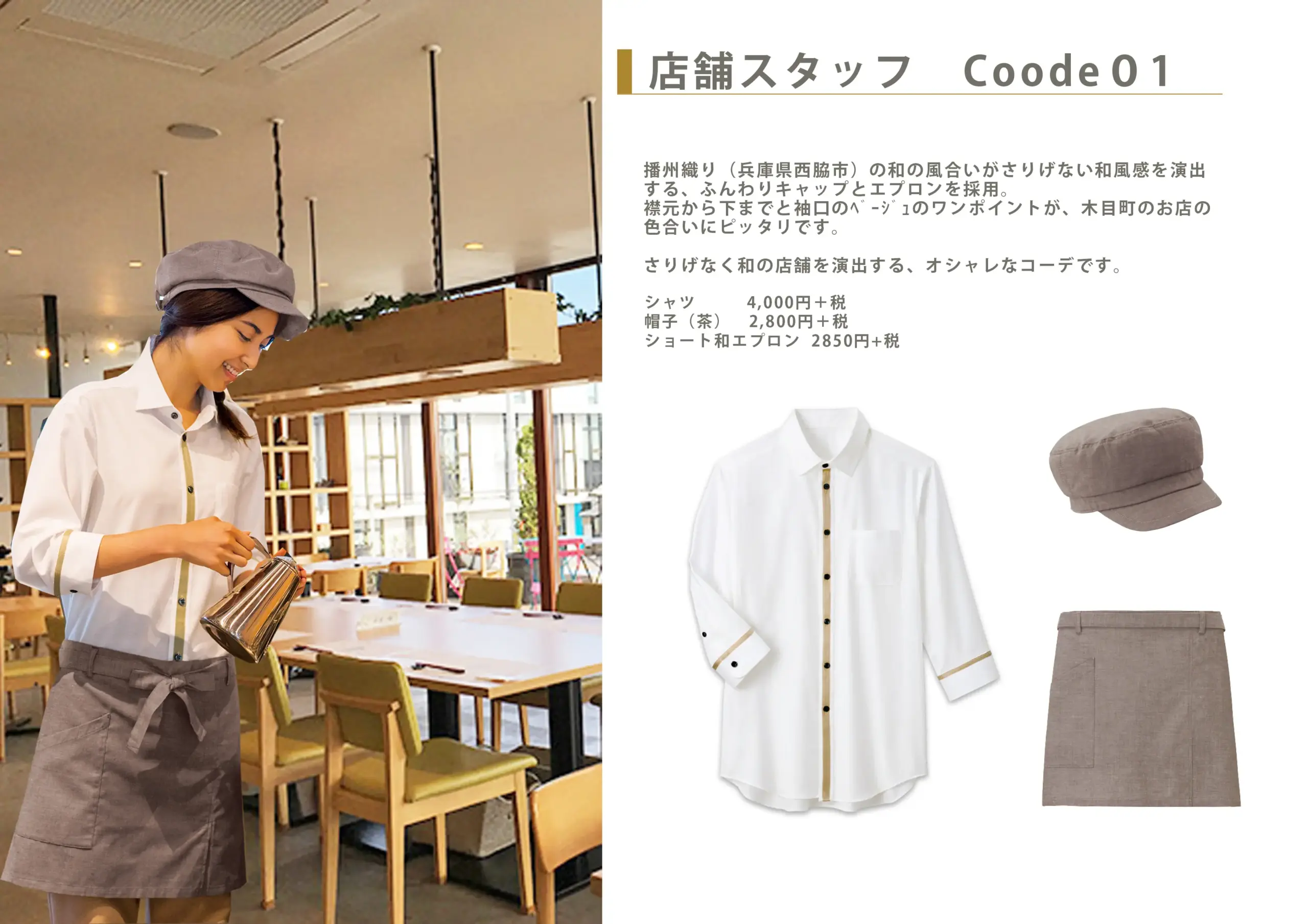 S003 飲食店制服コーディネート ちょっと購入な食品販売店の料理、販売制服コーディネート。見た目の高級感と機能性のあるアイテムを組み合わせた加工食品販売店制服。