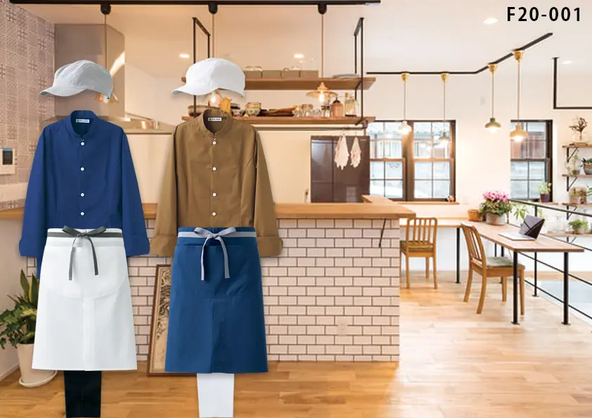 codeF25-S001 飲食店販売店店舗制服コーデ 食品スーパー・販売店向け|清潔感と親しみやすさを両立する胸付きエプロン&シャツのユニフォームコーデ