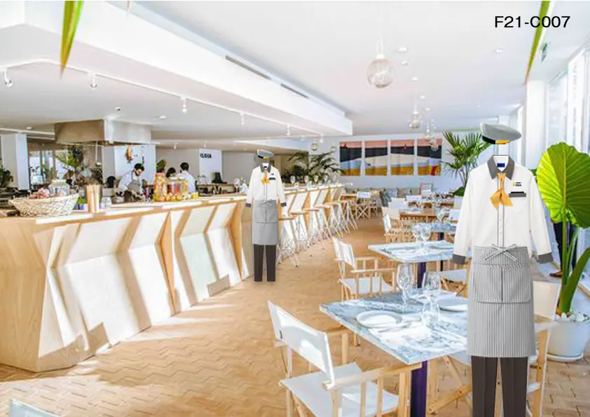 F21-C007 飲食店制服コーディネート 明るい元気なカフェのホールスタッフ制服コーデ。明るい日差しが注ぐ店舗に合うグレー×白の組み合わせで店内をさらに明るく。
