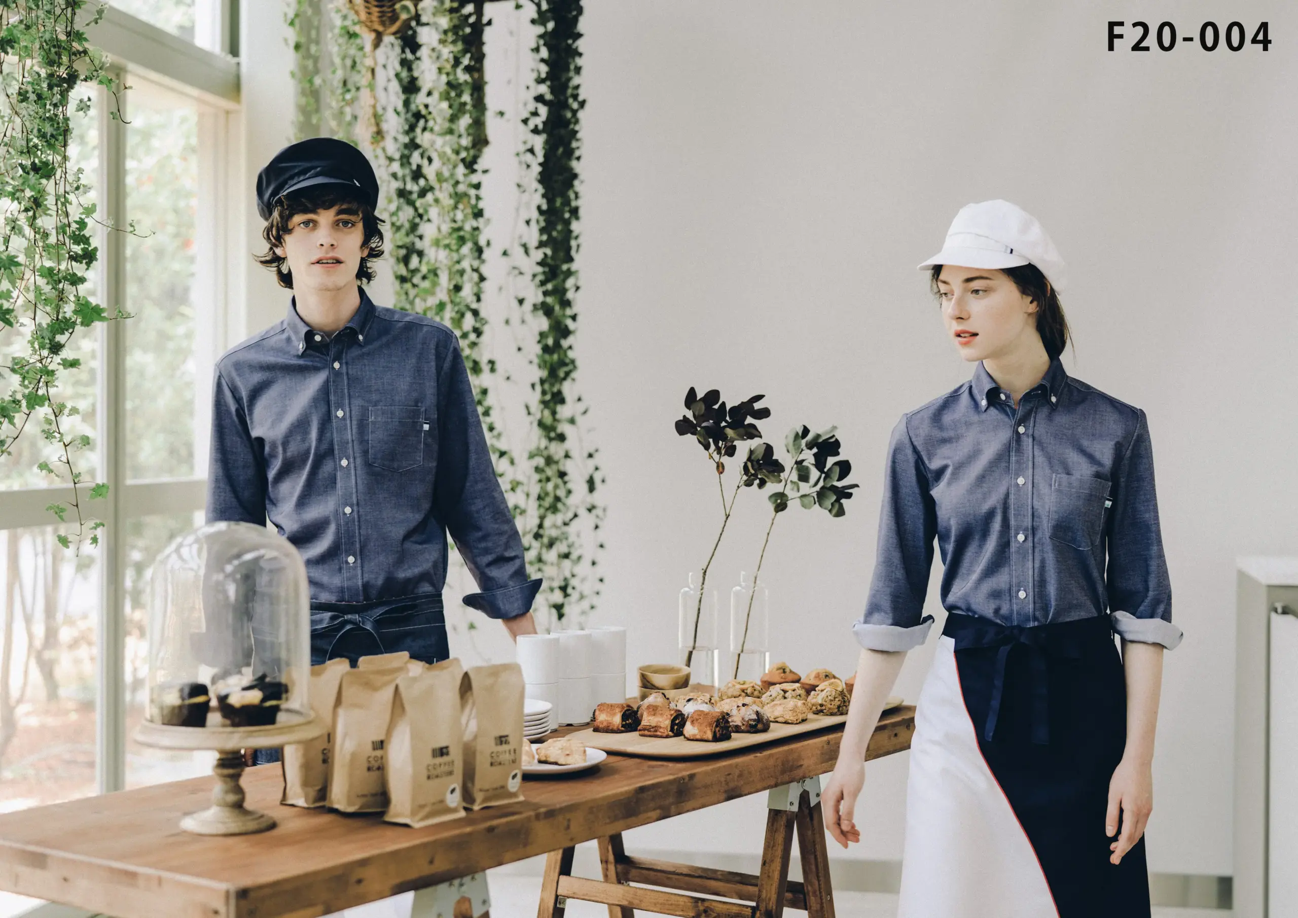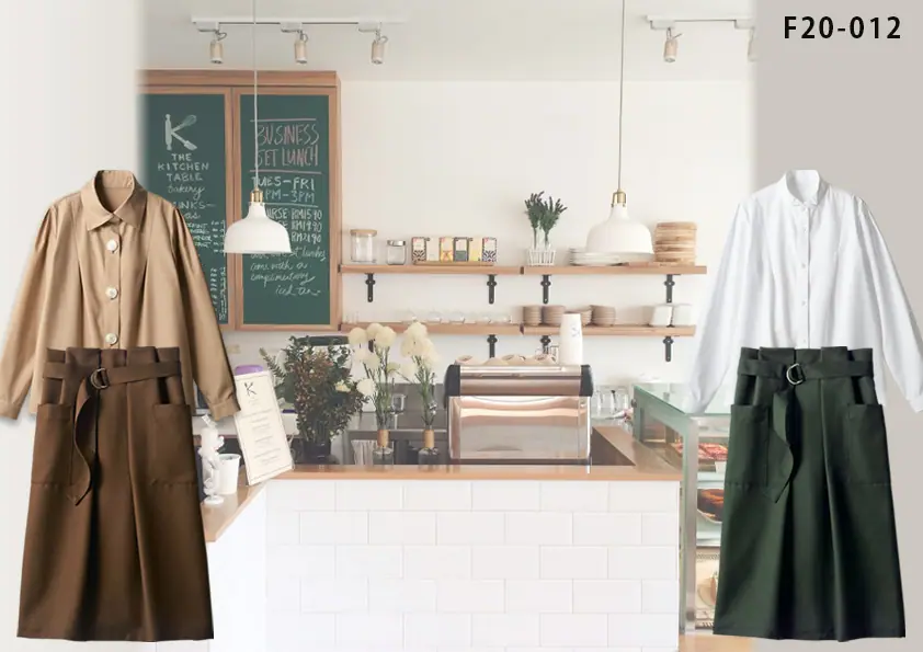 F20-011 飲食店制服コーディネート 白を基調としたかわいらしいスウィーツ店にオススメの茶系の温もりを感じさせる自然派テイストコーディネート