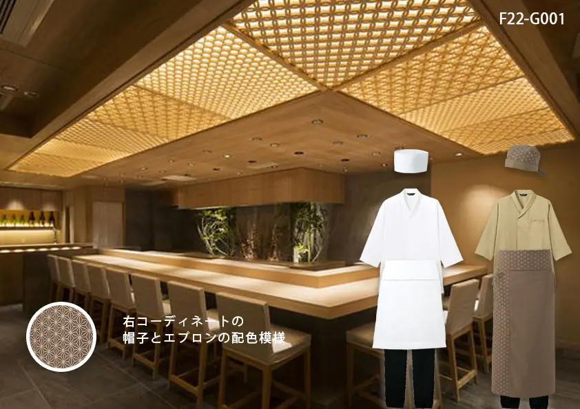 codeF25-G001 飲食店サービス店舗制服コーデ 高級寿司店に最適|幾何学柄が映える和モダン作務衣ユニフォームコーデ