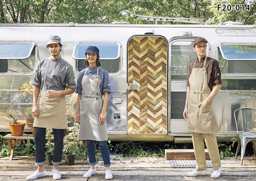 F20-033 飲食店制服コーディネート 木を使ったインテリアが多いナチュラルな店内にピッタリの茶系コーディネート