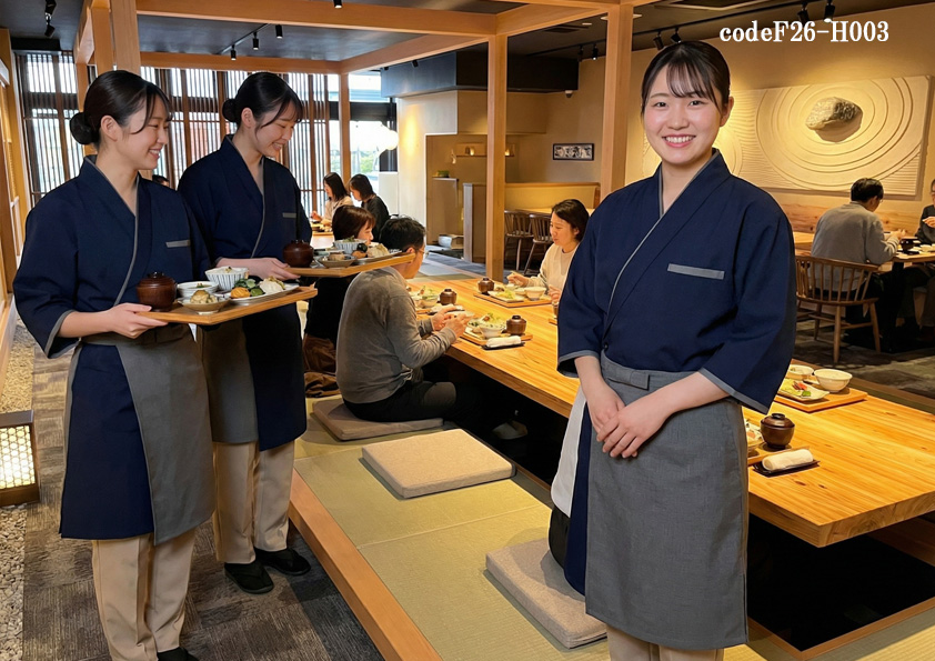 codeF26-H003 飲食店サービス店舗制服コーデ 和食店に映える新しい制服提案|2026年新作 ネイビー和コート×アシンメトリーエプロン