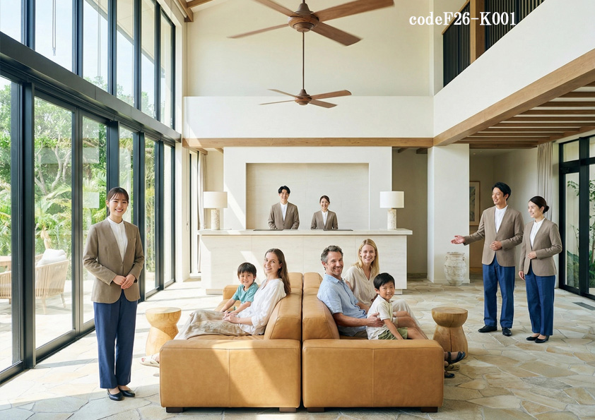 左側一面が前面ガラス張りとなり、自然光がたっぷりと差し込む開放的なロビー空間。天井は吹き抜け仕様で、ゆったりと回る空調用プロペラがリゾートらしい心地よさを演出する、洗練されたホテル空間に映える接客制服コーディネートです。