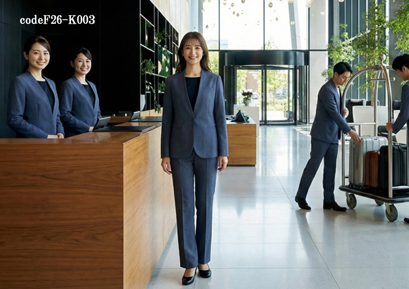 codeF26-K003 飲食店サービスホテル制服コーデ 都会的でおしゃれなビジネスホテル制服|ブルーグレーのノーカラージャケットで叶えるカジュアル接客ユニフォーム