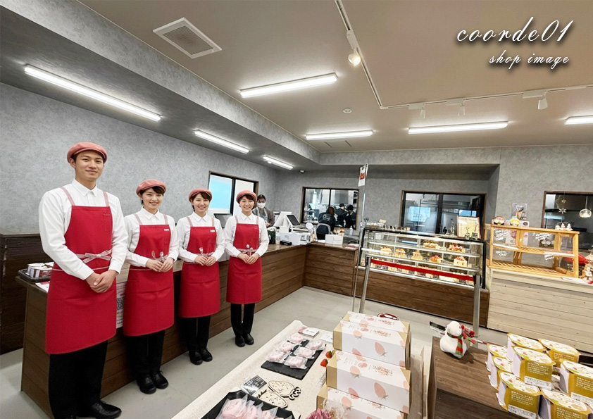 スイーツ販売店の制服リニューアルのコーデ提案依頼をいただきました。多種農産物の生産、スイーツ販売の会社様の店舗で、苺スイーツを特に数多いく販売されている店舗です。