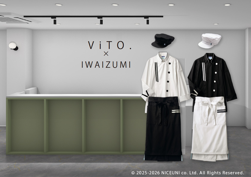 次にシルエットは、若年層スタッフでも自然に着こなせる“ややゆったり×今っぽい抜け感”。コック風エプロンやストライプ柄、切替デザインを取り入れることで、シンプルながら印象に残るユニフォームに仕上げました。