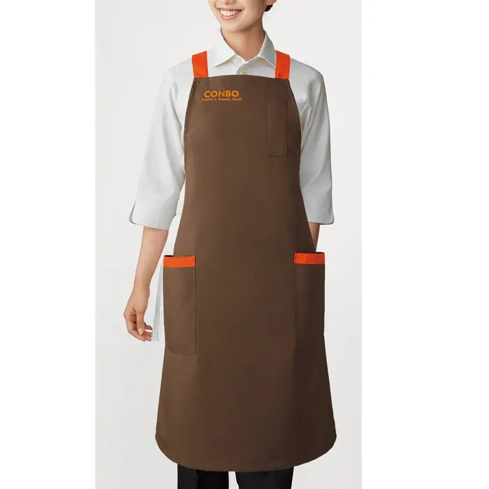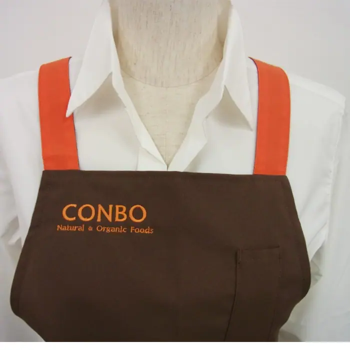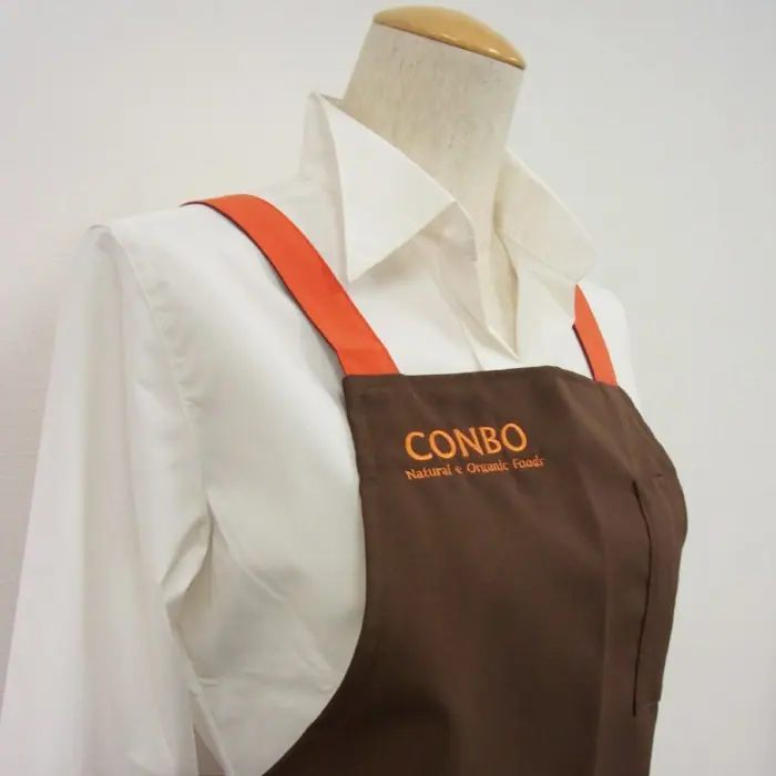 個性的な胸付エプロンを使った刺繍入れユニフォームをご注文いただきました。