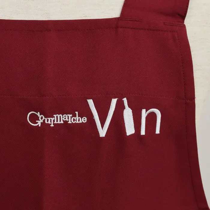 ワイン色のエプロンに1色でロゴマークとのことでしたので、ワイン色に相性のいい糸色の白かベージュをご提案。