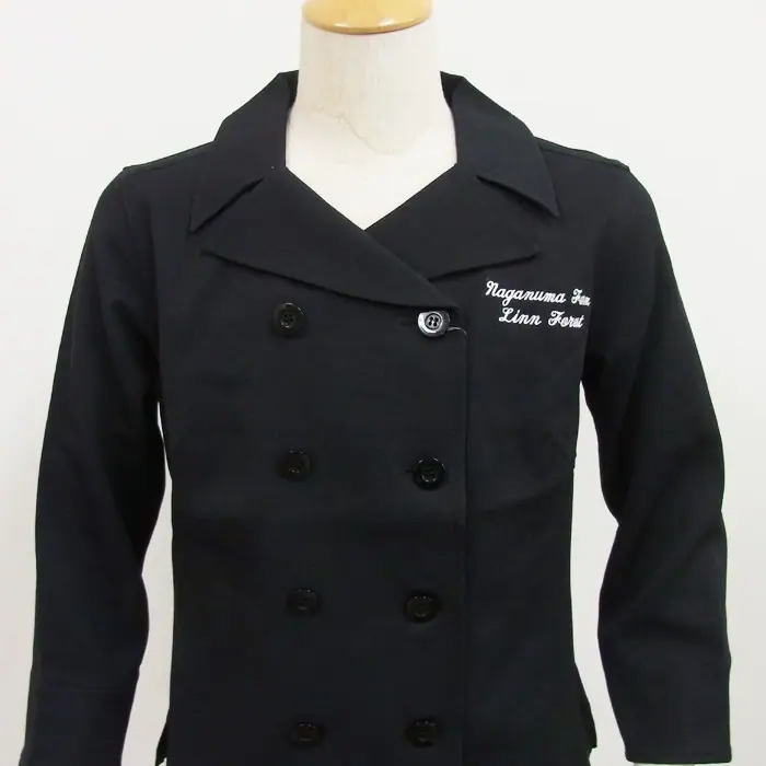 ブラックのピーコート風コックコートに白い糸でのネーム刺繍です。