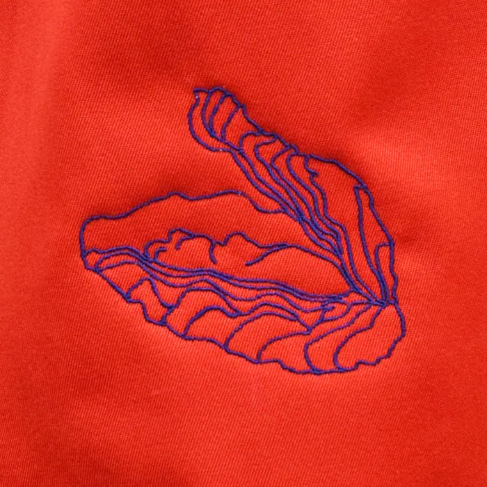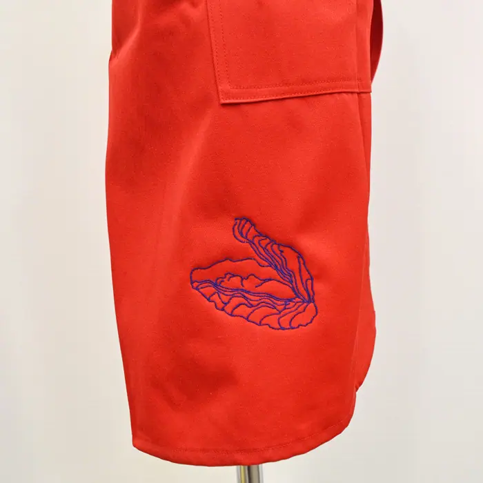 牡蠣の刺繍が大きくされていて、シンプルでスタイリッシュなデザインです。 お店の雰囲気にもぴったりなオシャレなエプロンに仕上がりました。