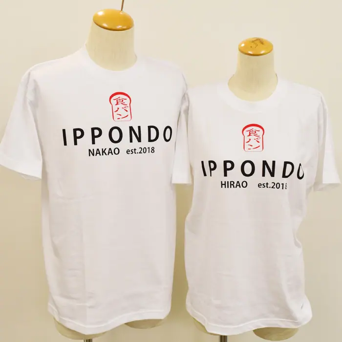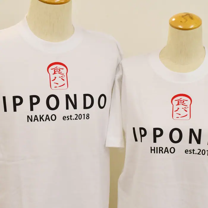 2018年に福岡に新規オープンされた食パン専門店一本堂 平尾店様と中尾店様に、新規オープンのお祝いと感謝の気持ちで、プレゼントとして勝手に店舗様のオリジナルTシャツ作っちゃいました。先日店舗にうかがってお渡しできました。