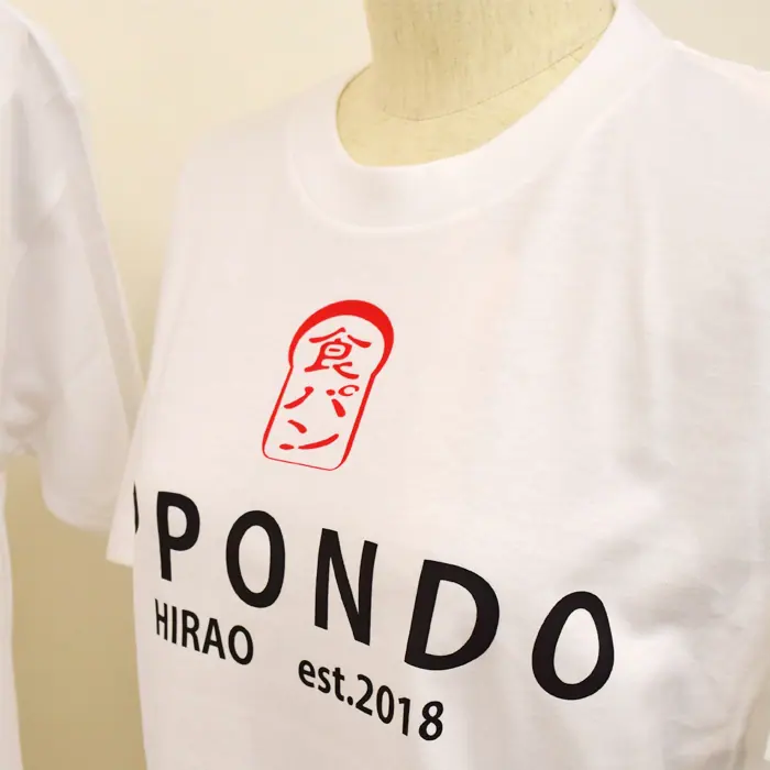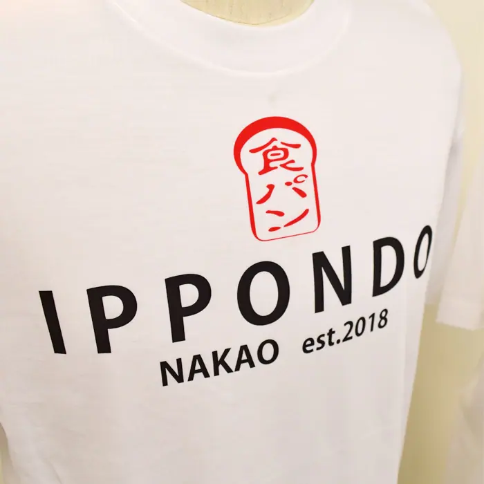 IPPONDOとシンプルな書体で、その上に食パンのマークを赤でプリント。下の段には店名と設立年est.を。白いTシャツに黒と赤でシンプルにデザインしました。