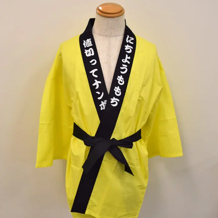 登場するアナウンサー用に3色のはっぴです。両えりに”値切ってナンボ”、”にちようももち”と白で転写。背中に”にちようももち”のロゴをどーんと大きくフルカラーで転写しました。