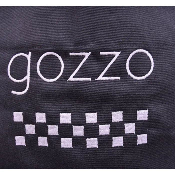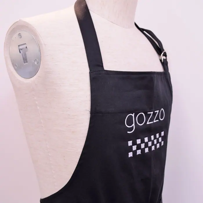 近頃胸付のエプロンの胸中央に大きく刺繍や、プリントするお客様が増えています。お店のロゴはもちろんですが、お店のコンセプトやお客様に伝えたい メッセージを刺繍、プリントされたりするケースも増えています。今回も胸の中央に刺繍しています。イマドキぽくてかっこいいです、よね。