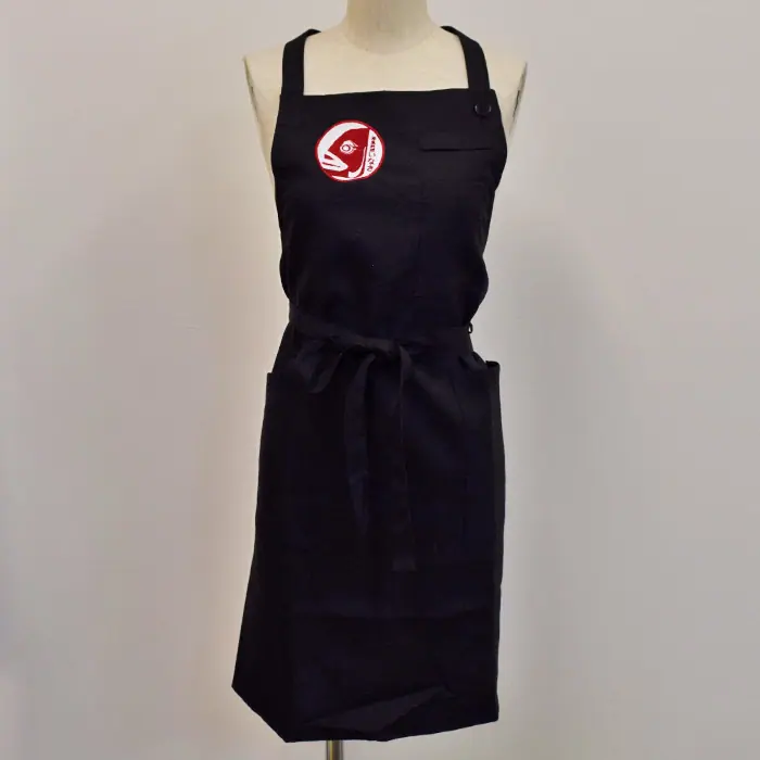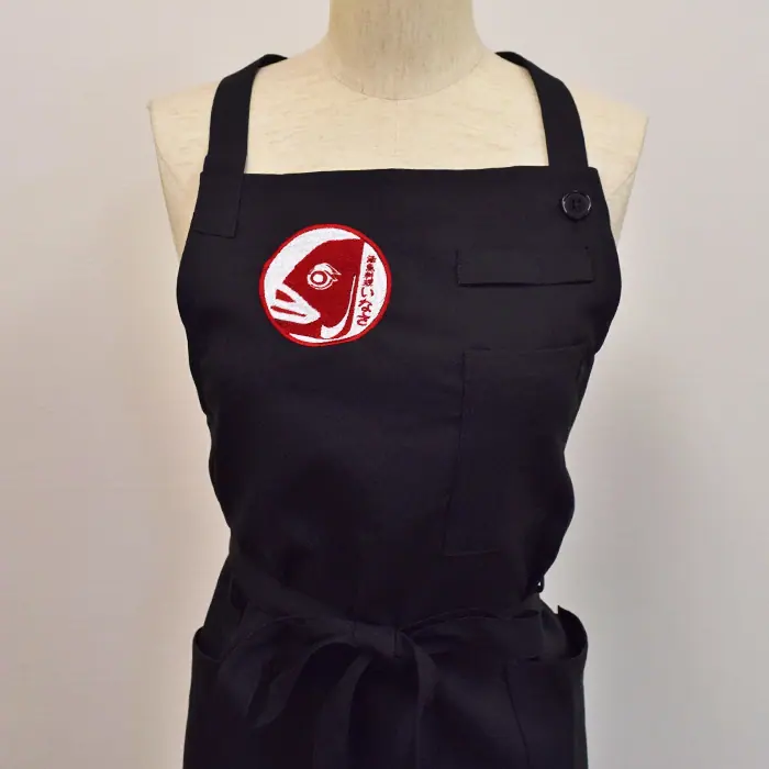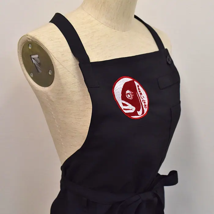 今の時代に必要不可欠な制菌加工が施された首掛けタイプの胸付きエプロンにロゴ刺繍をご依頼いただきました。
