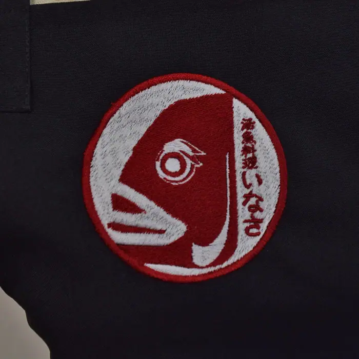 鯛の顔が大きく描かれたロゴが目を引きますね。当初は胸の真ん中に5cmほどで色もゴールド一色でご注文を頂いておりましたが、仮縫いをご確認いただいた後にサイズをもう少し大きくして色も赤と白で刺繍をしたいとご要望されました。その結果刺繍の位置は右胸になりましたが、とてもめでたい仕上がりになりました。