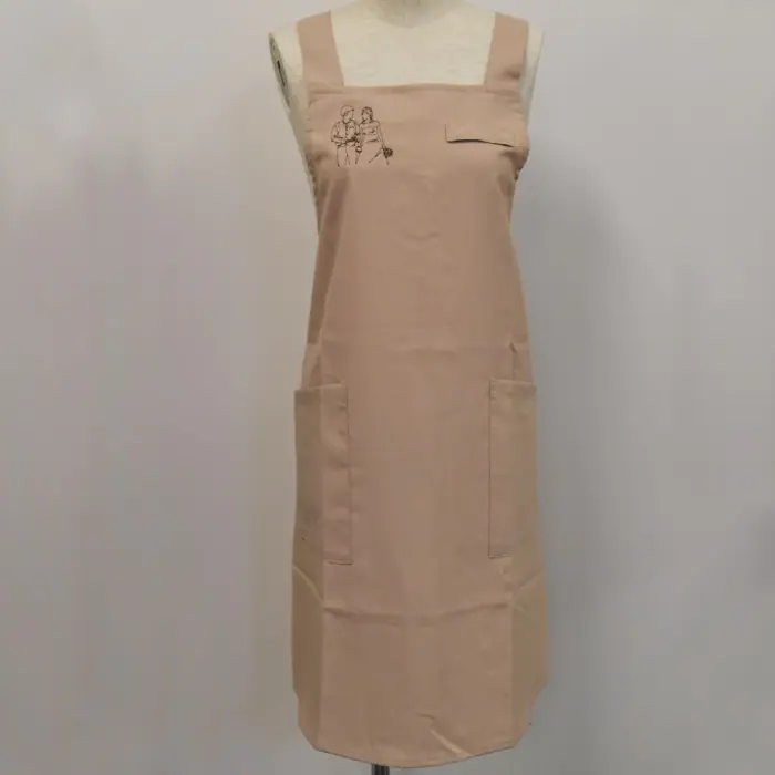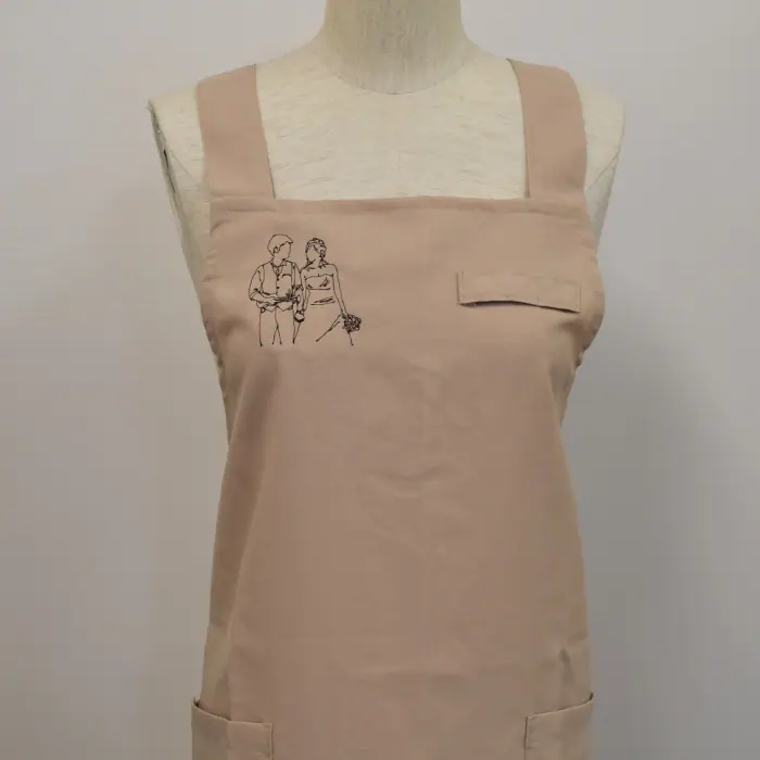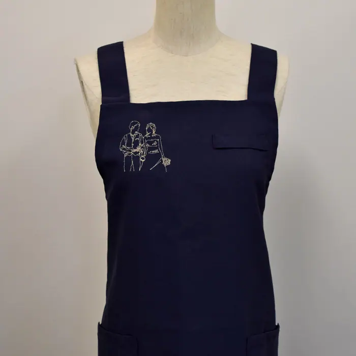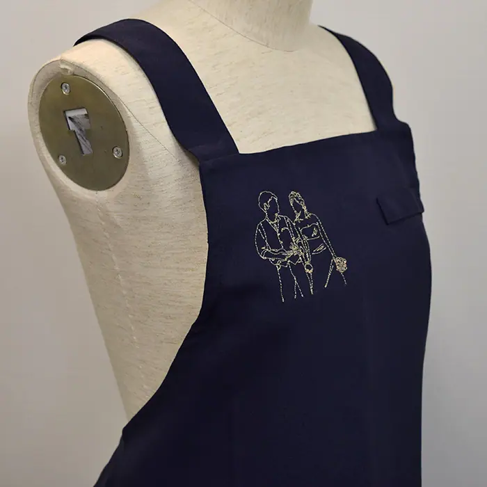 シンプルな形で男女、年齢を問わずご利用いただけるタスキ型タイプのエプロンへロゴ刺繍をご依頼いただきました。