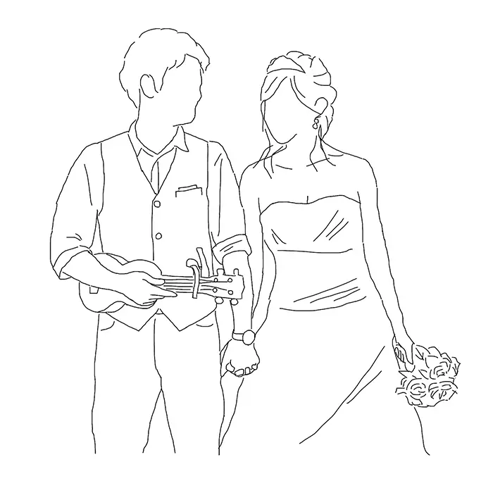 今流行りの手書き風イラストがとてもオシャレです。ご結婚のお祝いでしょうか、お客様が描かれたと思われるイラストを刺繍にいたしました。細い線で描かれているので全てステッチで縫っております。そのため手縫い刺繍のような素朴で温かみのある仕上がりになりました。