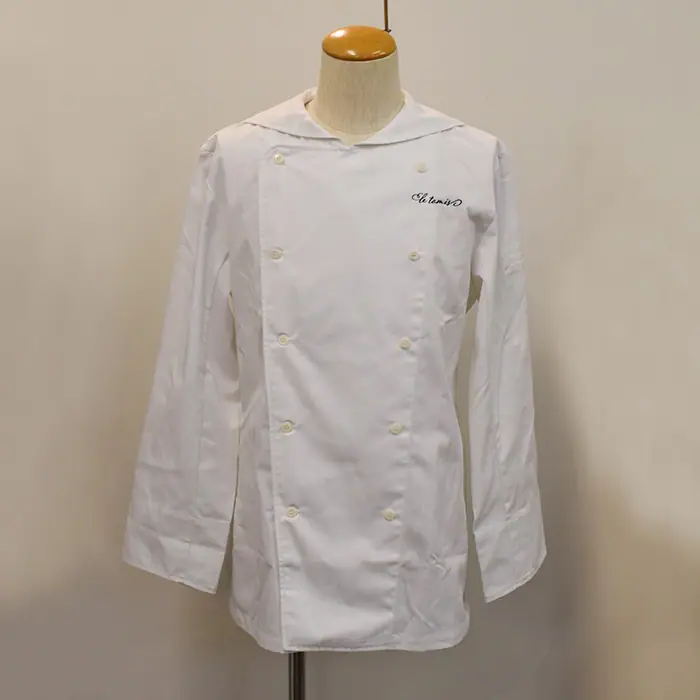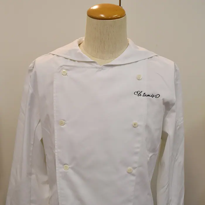 遊び心のあるセーラー襟が印象的なコックコートへのロゴ刺繍をご依頼をいただきました。