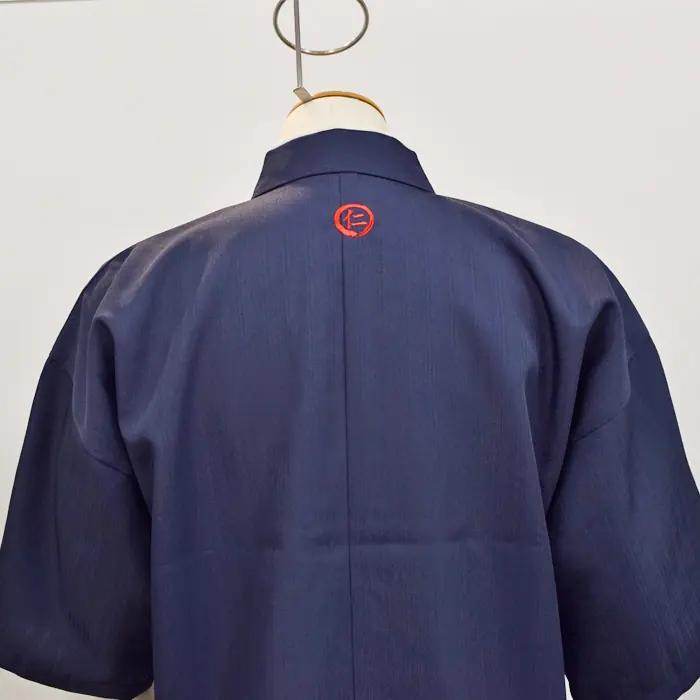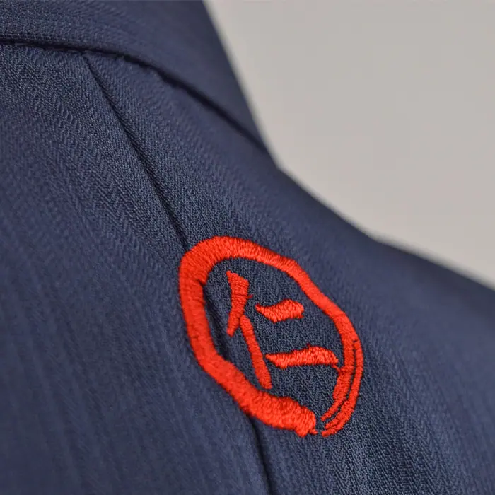 背中のロゴの糸色は極端に目立ちすぎず渋く表現するため、赤で刺しゅうしています。ネイビー(濃紺)の作務衣に赤糸は目立ちすぎず、かっこいい引き締まった雰囲気になrます。ユニフォームで刺しゅうをいれたいけど糸色にお悩みの場合はご参考にされてください。