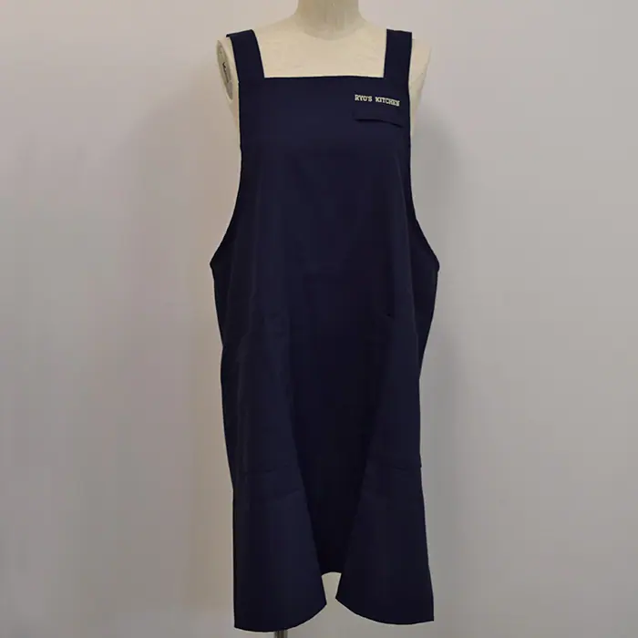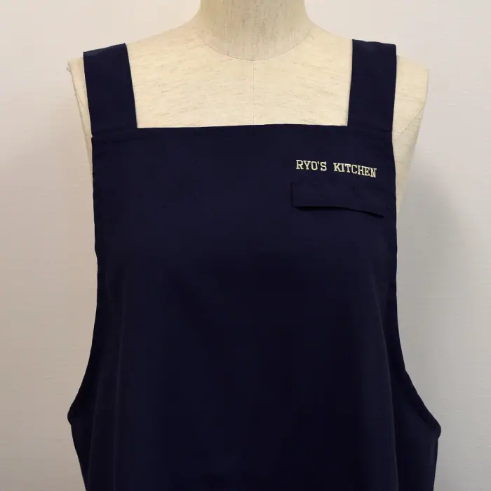 ネイビーのエプロンにベージュの糸がセンスの良さを際立たせています。書体もカクカクとしたアスレチック体がとてもオシャレですね。