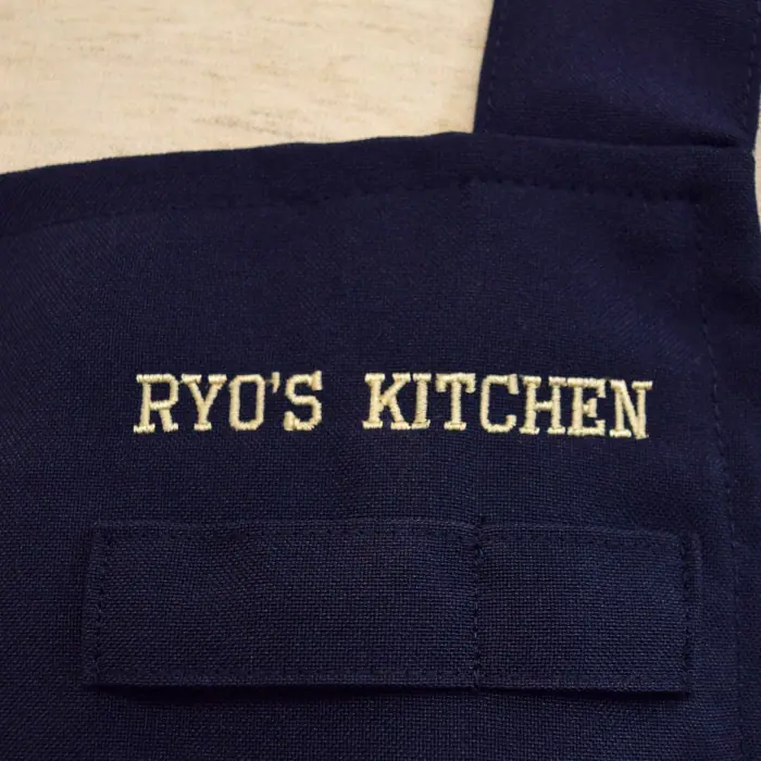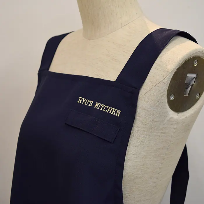 男女問わず着こなせるシンプルなデザインのH型エプロンへネーム刺繍をご依頼いただきました。