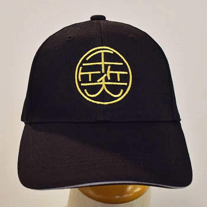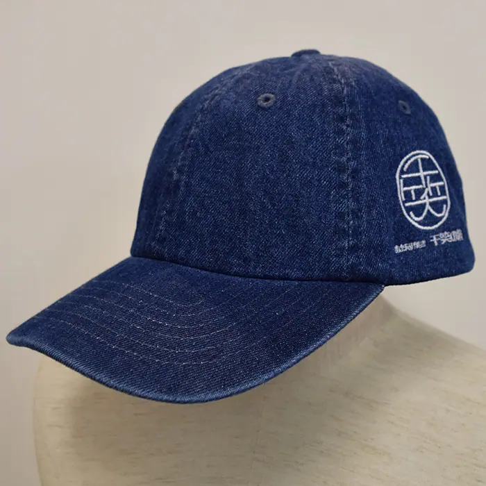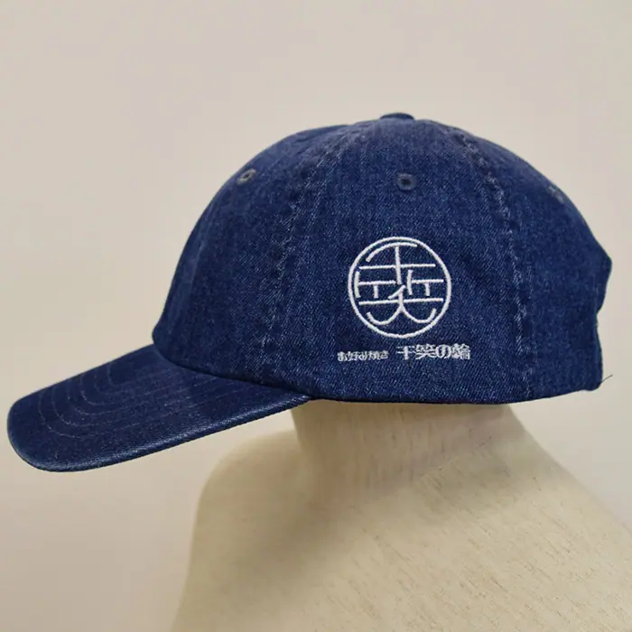 黒いキャップは前面に大きく丸いロゴを刺繍させていただきました。黒にゴールドが映えてとてもインパクトのある仕上がりになりました。デニムのキャップには左面に丸いロゴと文字を刺繍しております。こちらもカジュアルでカッコよく仕上がっています。