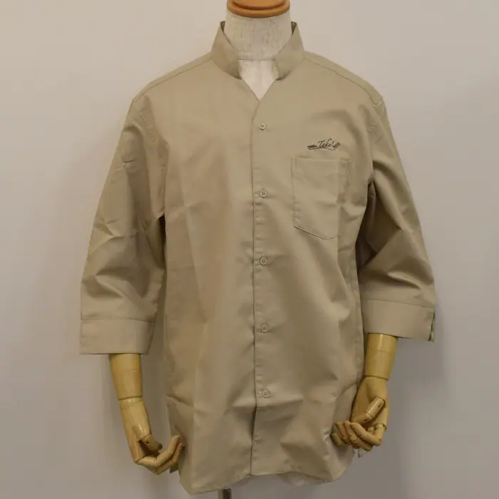 Vネックとスタンドカラーが合わさった変わったデザインのシャツへロゴ刺繍をご依頼い頂きました。