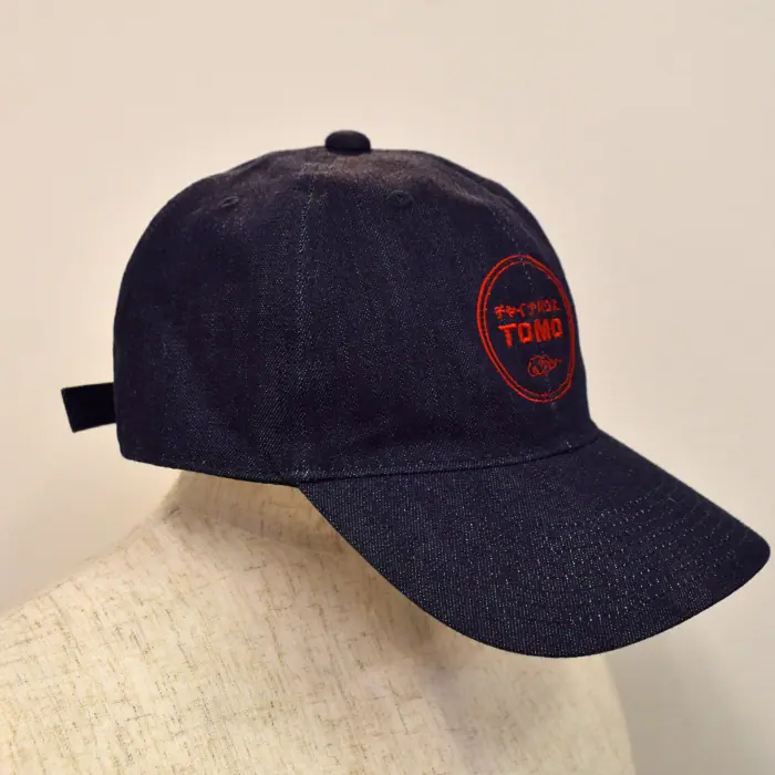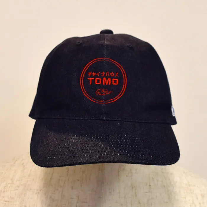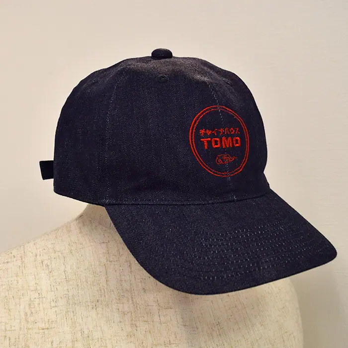 デニムの生地に赤の糸色が目を引きます。筋斗雲のロゴが中国風でとても可愛いですね。