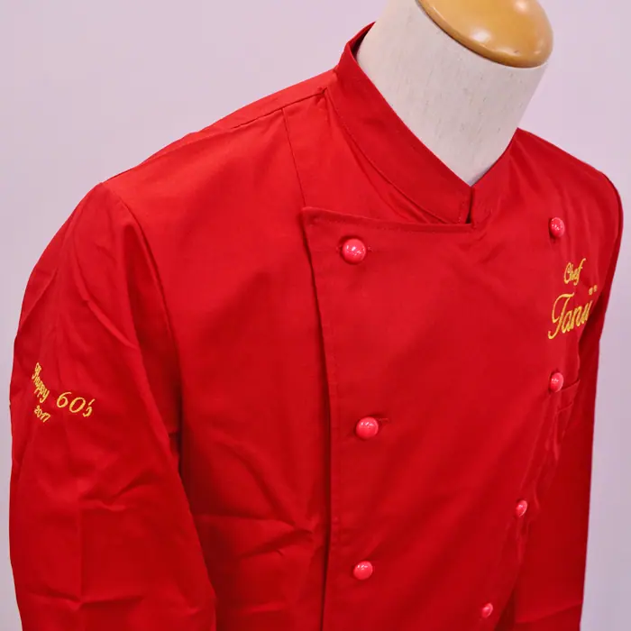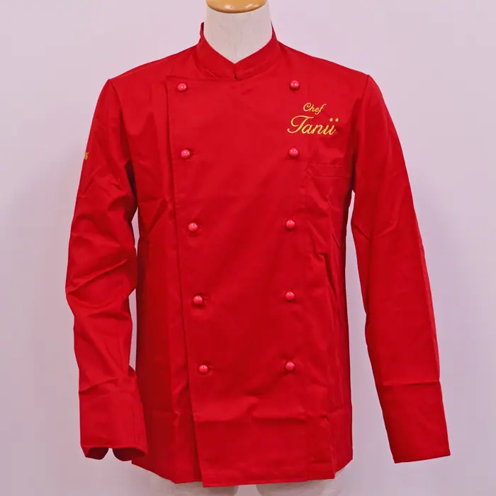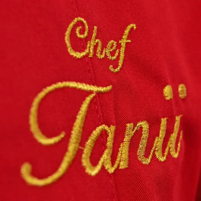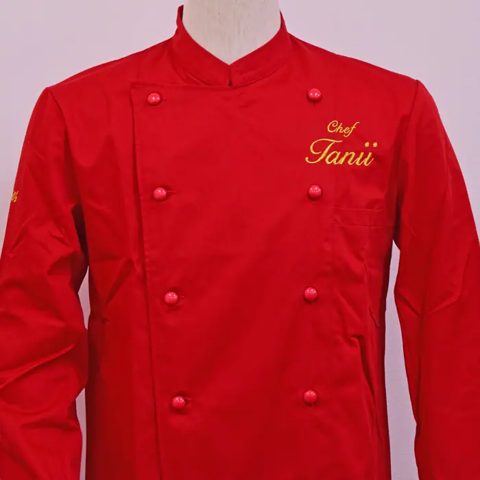 当初、赤いエプロンを探しているということでした。本当は赤いコックコートを探していて、なかなか見つからないし、高いかなと思って半ばあきらめて いましたとのこと。オススメの赤いコックコートをご提案して、これにキラキラしたゴールドの糸色で胸に刺しゅうをされたらどうですか?と書体(バランタインスクリプト)と 刺しゅう校正をご提案し、ご採用いただきました。