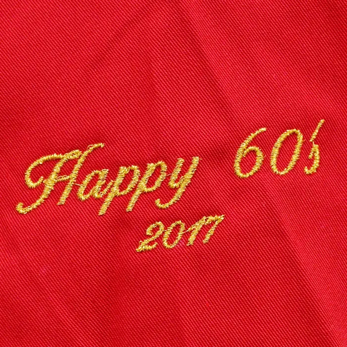 右袖の”Happy 60's/2017”はナイスユニの案でさらにご提案して刺しゅうしました。