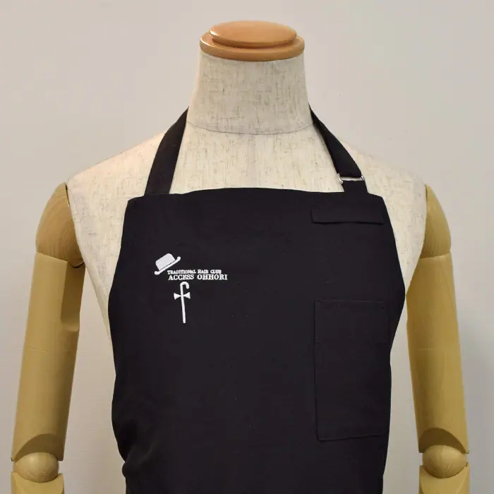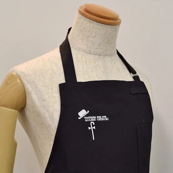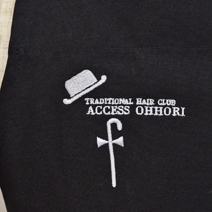 福岡県民ならご存じの老舗理容室アクセスオオホリ様のロゴ入り胸付エプロンの制作をさせていただきました。
