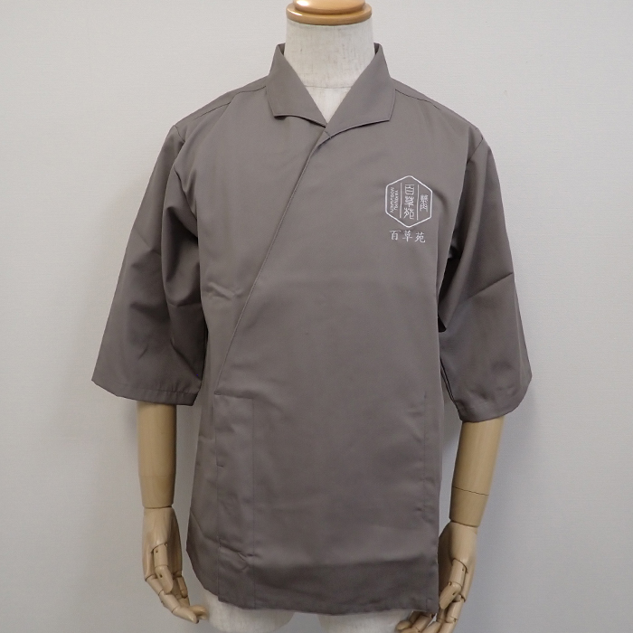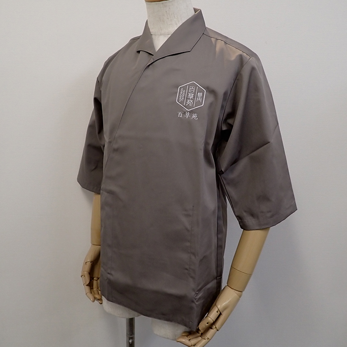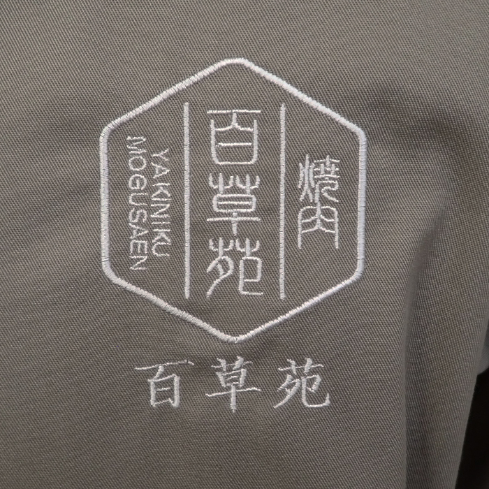 白刺繍はどんな生地色にも馴染みやすく、特に今回のような上品なグレートーンのコックコートには抜群の相性を発揮します。シンプルでありながら、刺繍ならではの立体感や糸の艶が生まれ、プリントには出せない“品のある存在感”が際立ちます。飲食店制服にロゴ刺繍を施すことで、ブランドの世界観を明確に伝えられるだけでなく、スタッフの統一感やプロフェッショナルな印象が強化され、店舗全体の価値を高める効果があります。