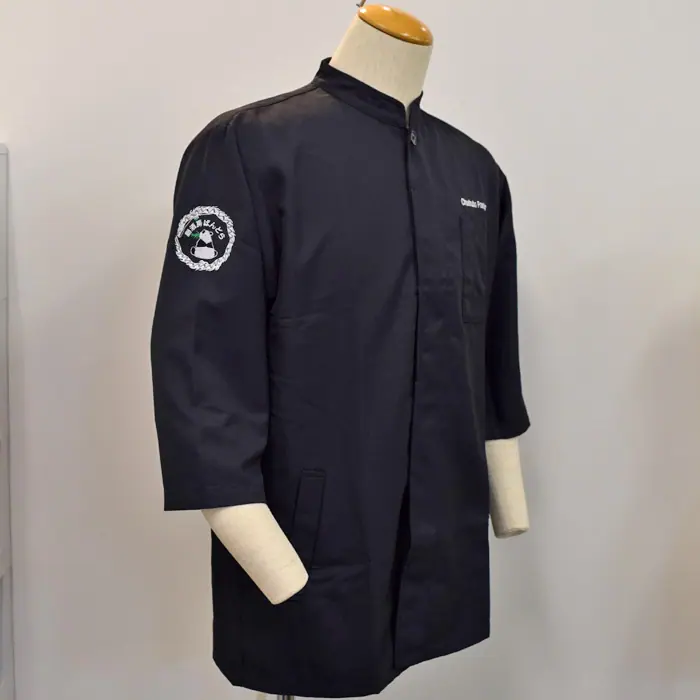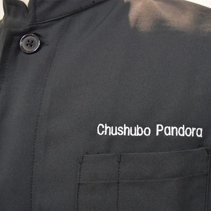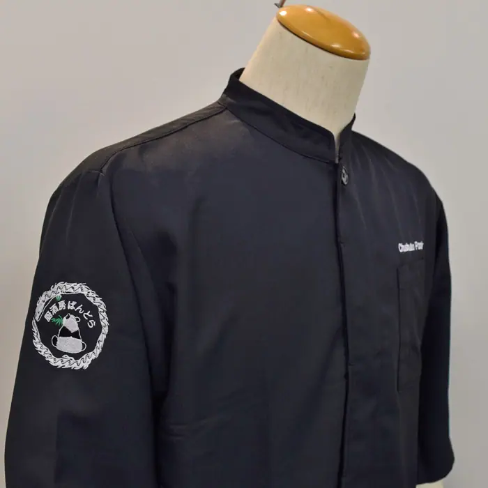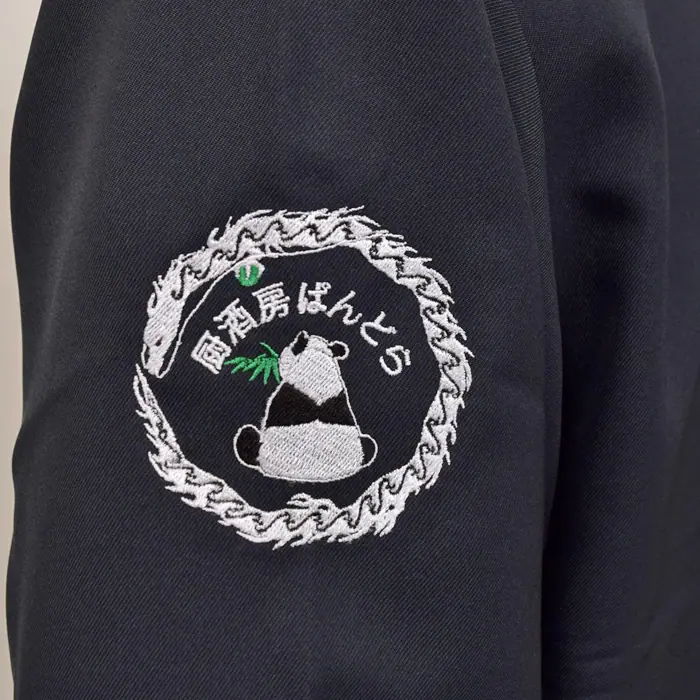 黒のコックコートの右腕にかわいいパンダのロゴ刺繍を、左胸に店名をネーム刺繍しました。右腕のパンダのロゴ、とってもかわいいですよね。