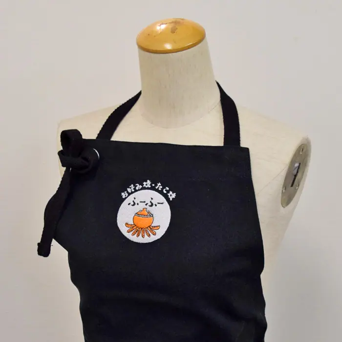 お好み焼き・たこ焼きふーふー様より、ロゴ刺繍入りオリジナルエプロンの制作をさせていただきました。