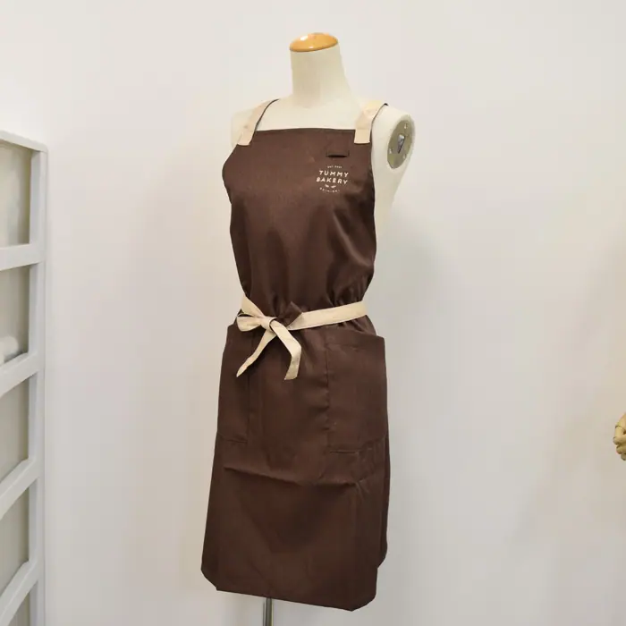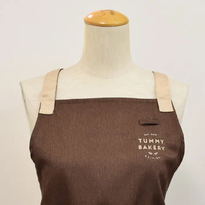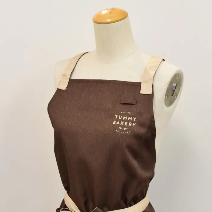 かわいいロゴ刺繍入りエプロン制作の紹介です。茶色の胸付エプロンに、素敵なロゴ刺繍を入れて素敵なオリジナル制服を制作させていただきました。